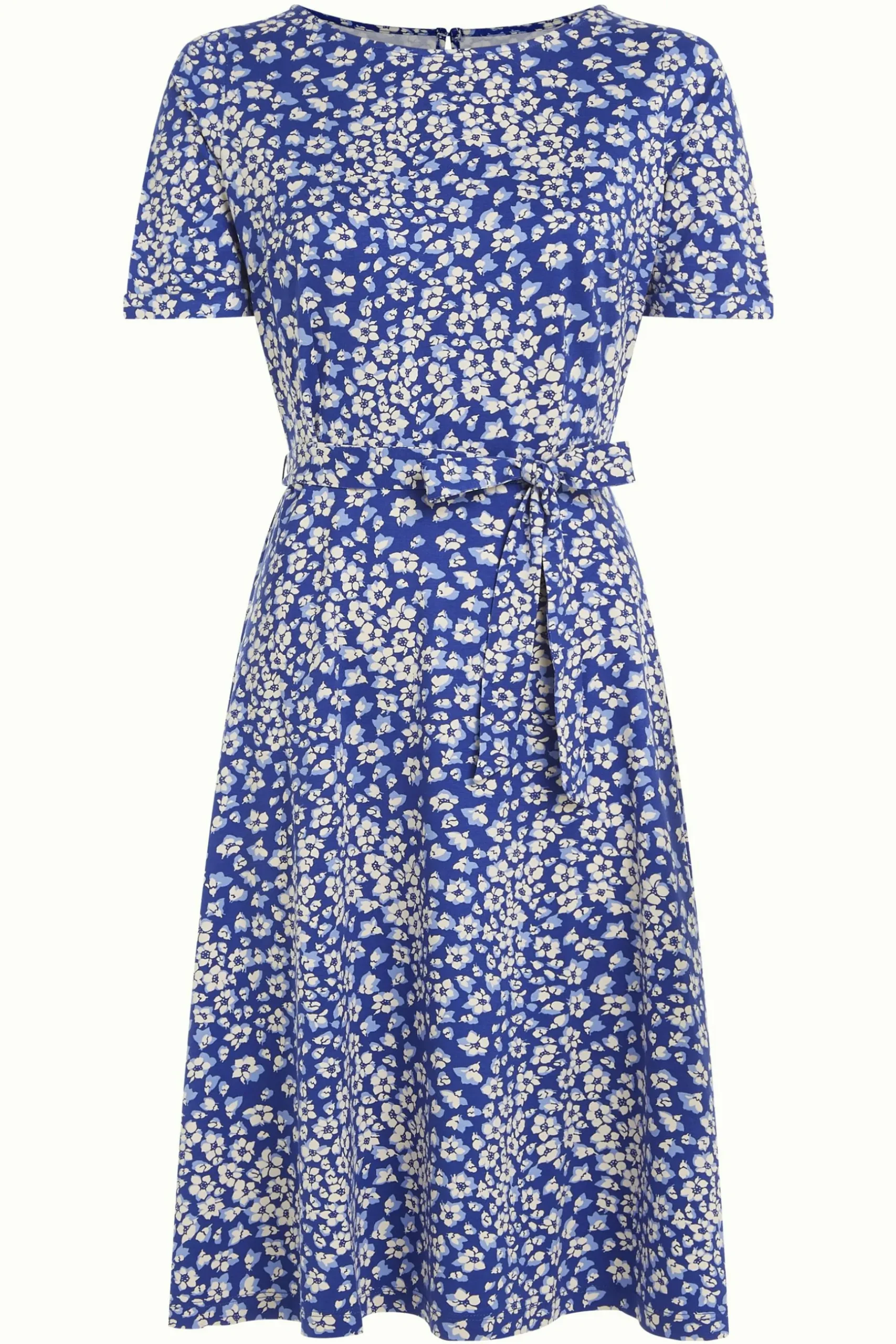 Product details Wijd uitlopende jurkRonde halsKorte mouwenStrikceintuurKnoopsluiting op de rugJerseyStretchBloemenprint…