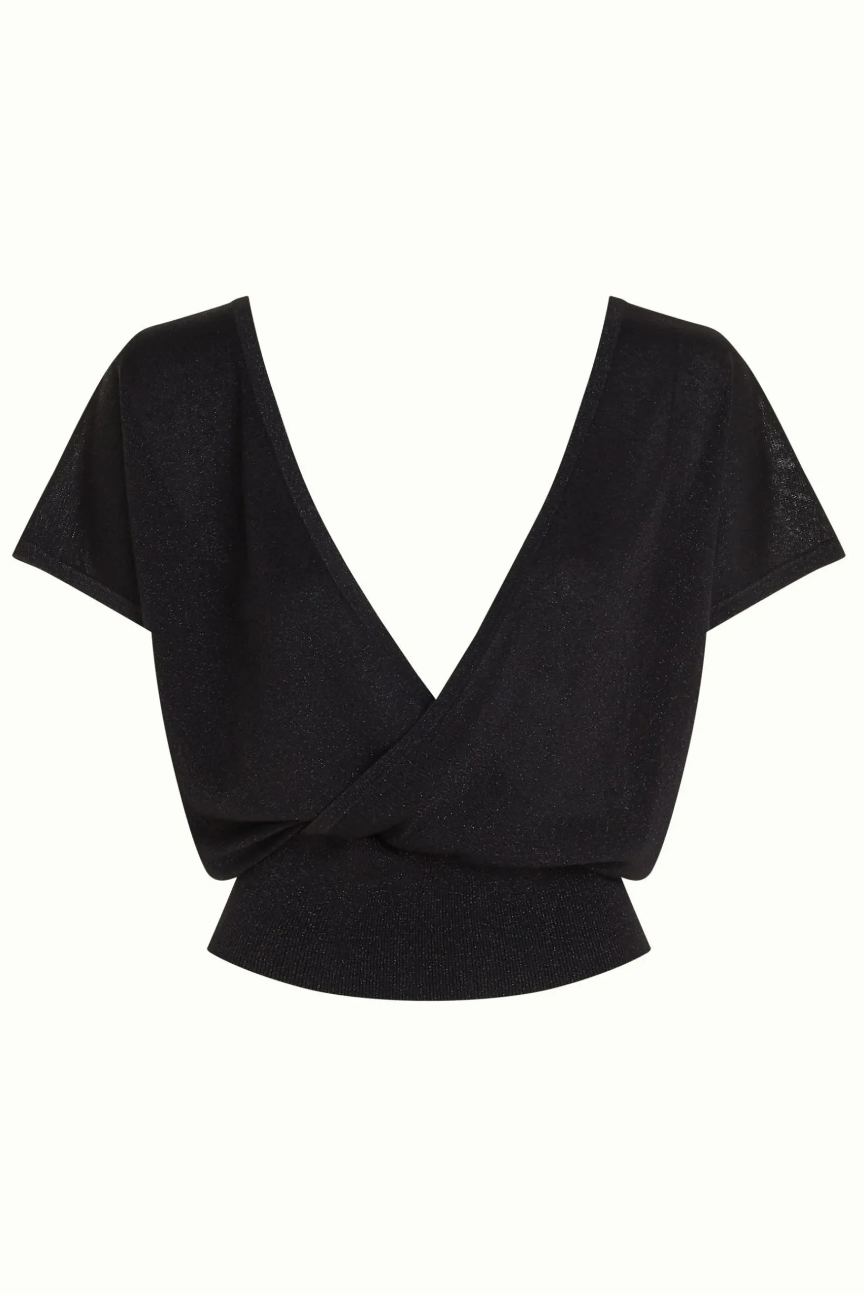 Product details Gebreide topDiepe dubbele V-halsKorte mouwenElastische breede zoomGlitter knitStretch productspecificat…
