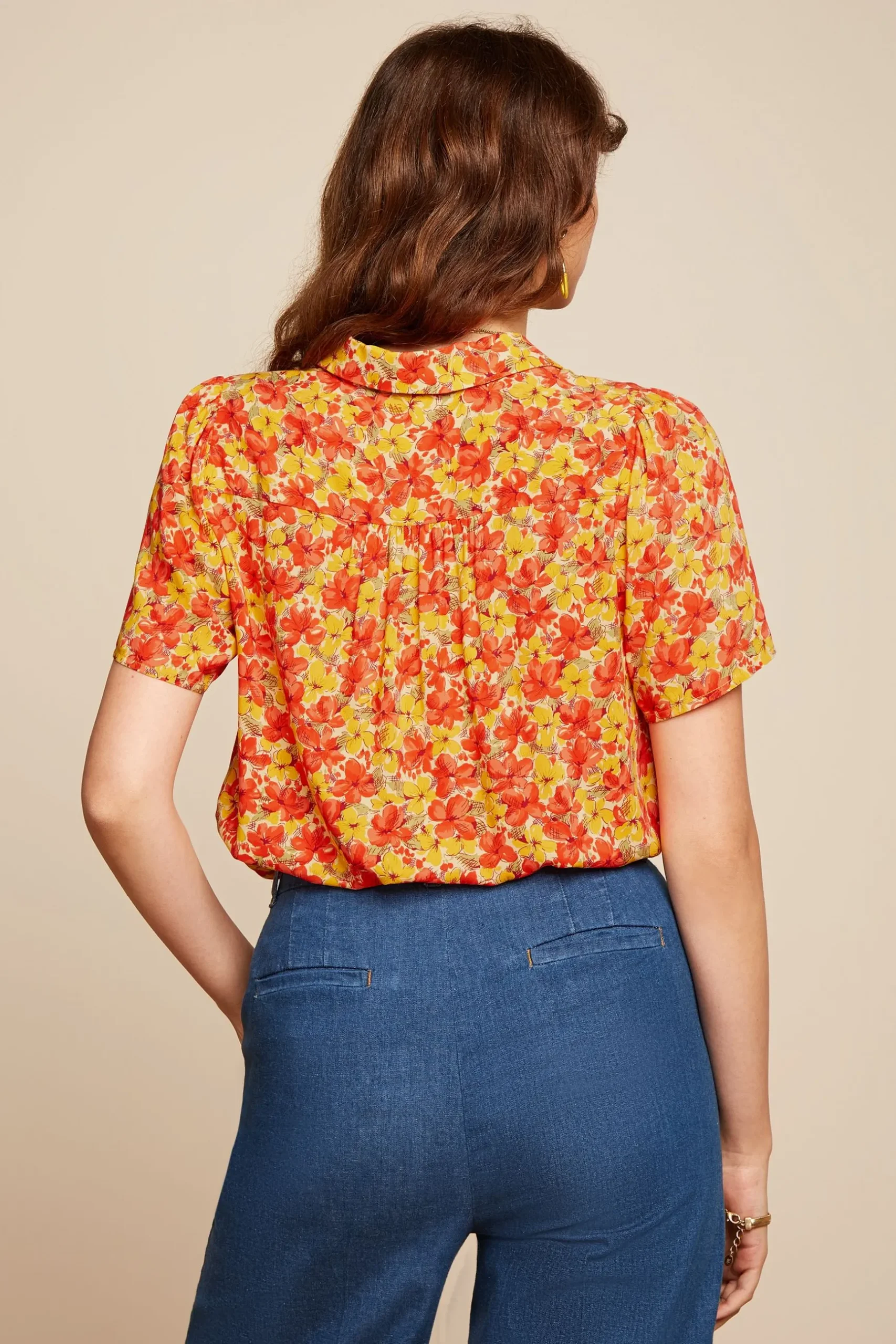 Product details Blouse met losse fitKorte mouwenBlouse kraagKnoopsluitingGewevenNon stretchBloemenprint productspecific…