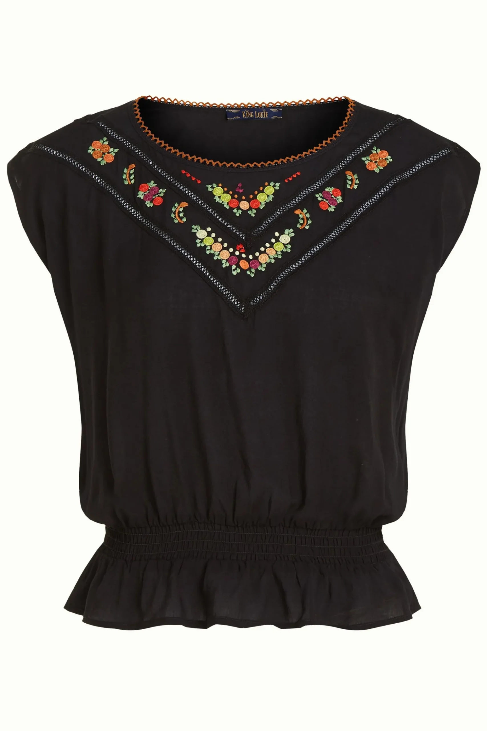 Product details Top met borduurselLosse fitKorte mouwenRonde hals met rik rak randjeElastisch boordGewevenNon stretch p…