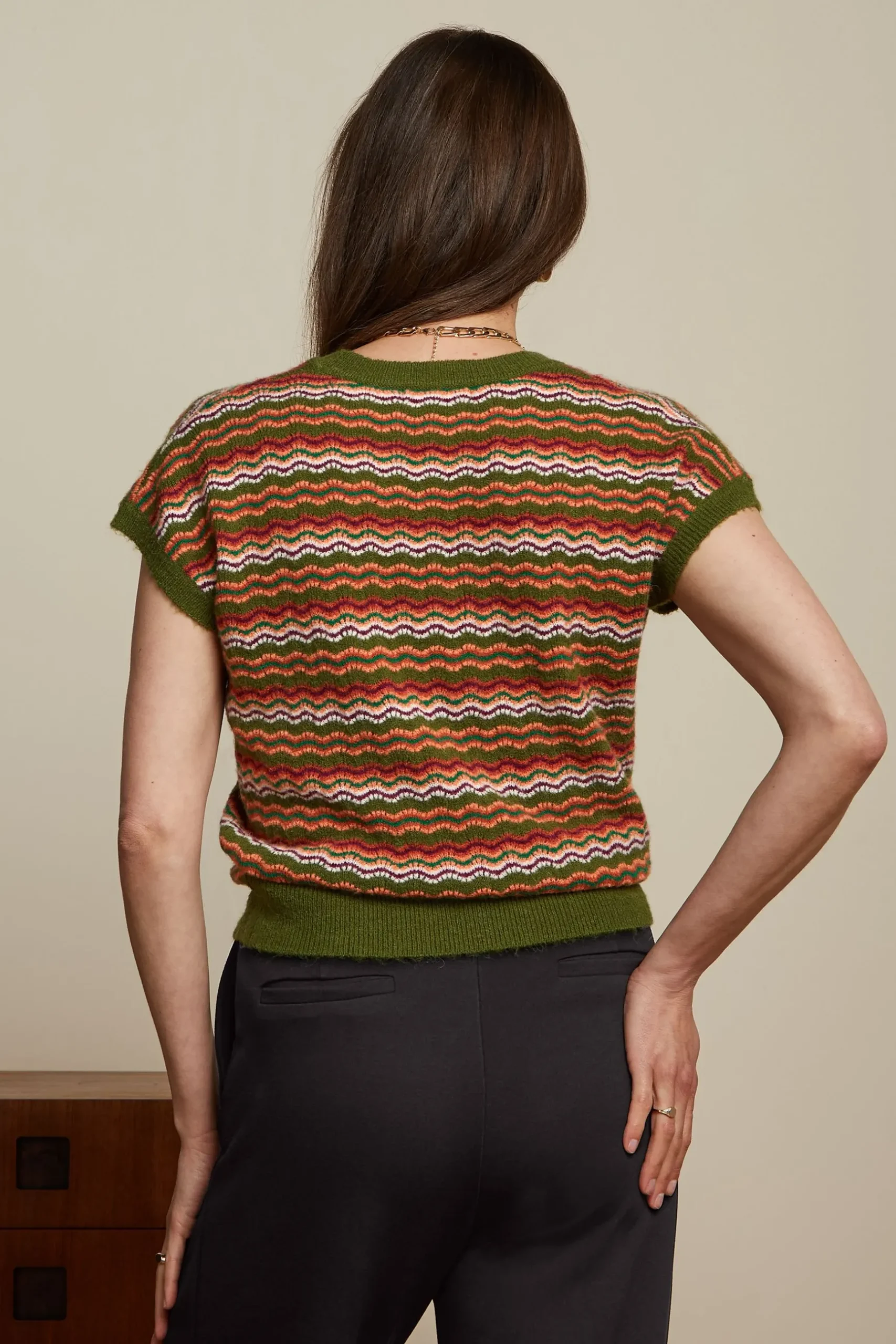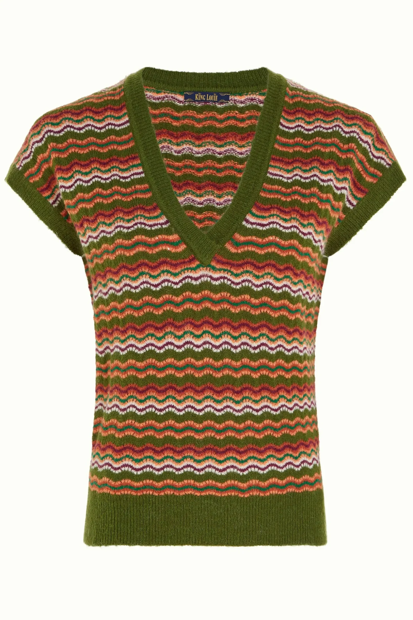 Product details SpencerV-halsMouwloosGeribbelde, contrasterende boordenGebreidStretch stofGolvend motief productspecifi…
