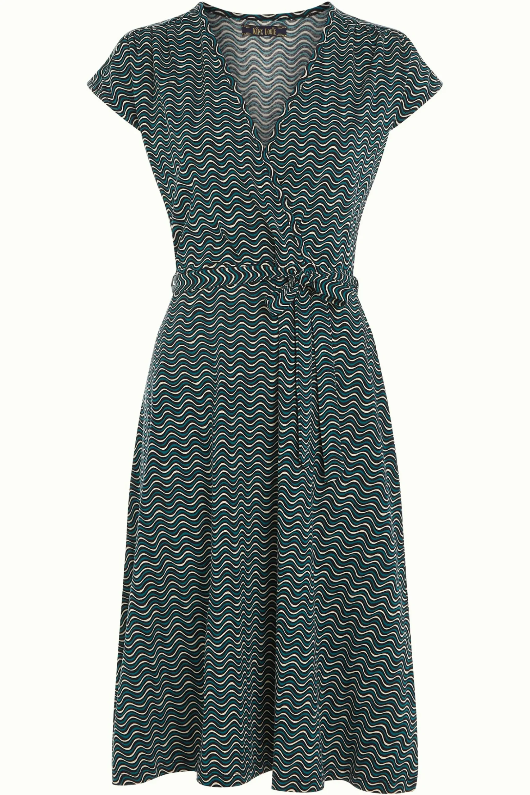 Product details OverslagjurkV-halsKorte mouwenWijd uitlopende rokVaste taillebandJerseyStretchstofGolvende print produc…