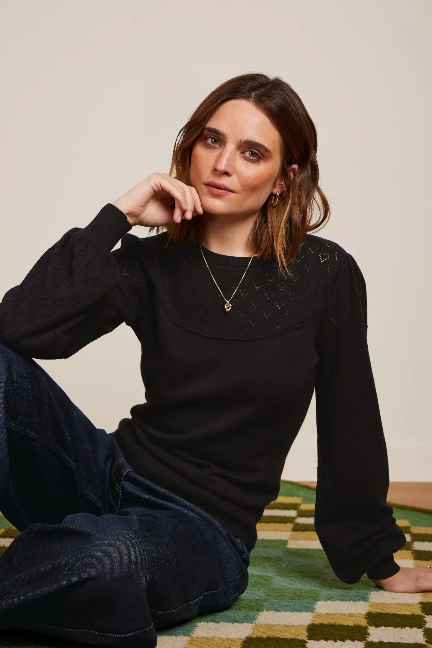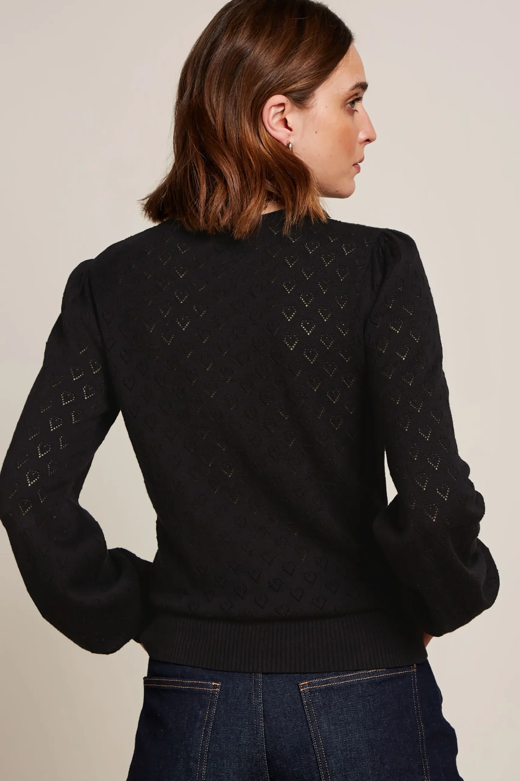 Product details Gebreide truiRond halsLange ballonmouwenHartjes motief in de schouderpas en mouwenStretchstof productsp…