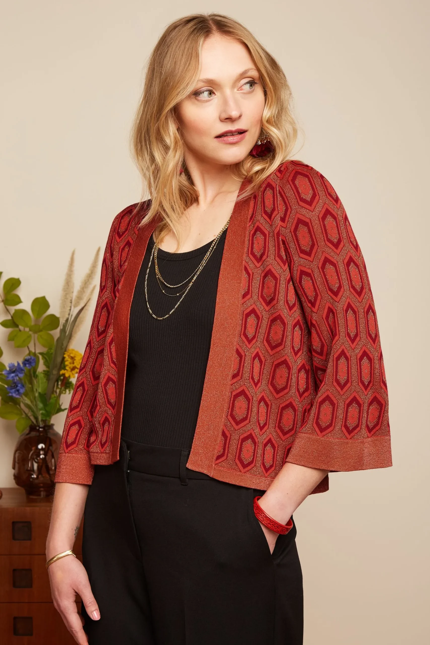 Product details Gebreid vestKimono stijlDriekwart mouwenStretchGrafisch patroon productspecificatiesGemaakt in: China P…