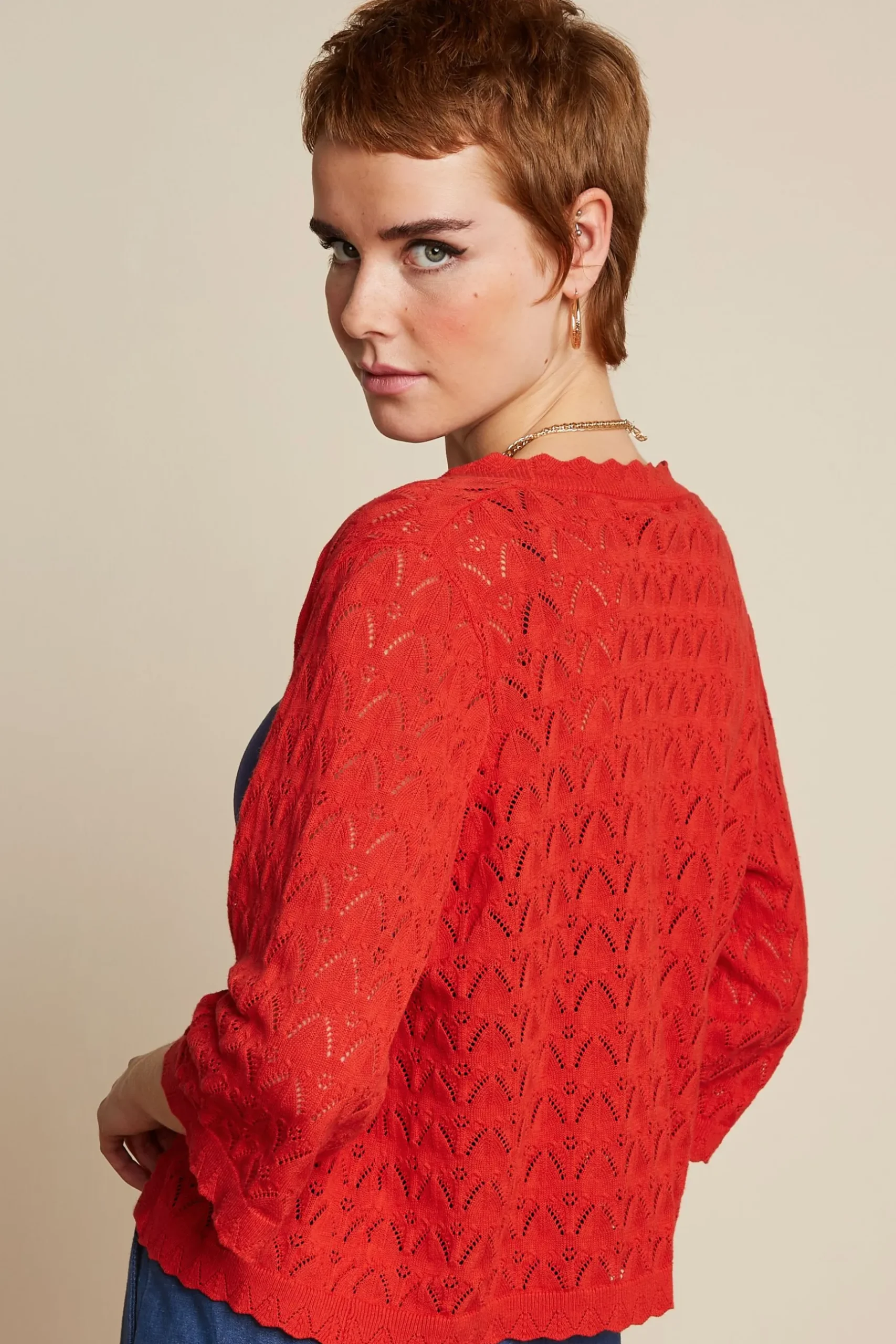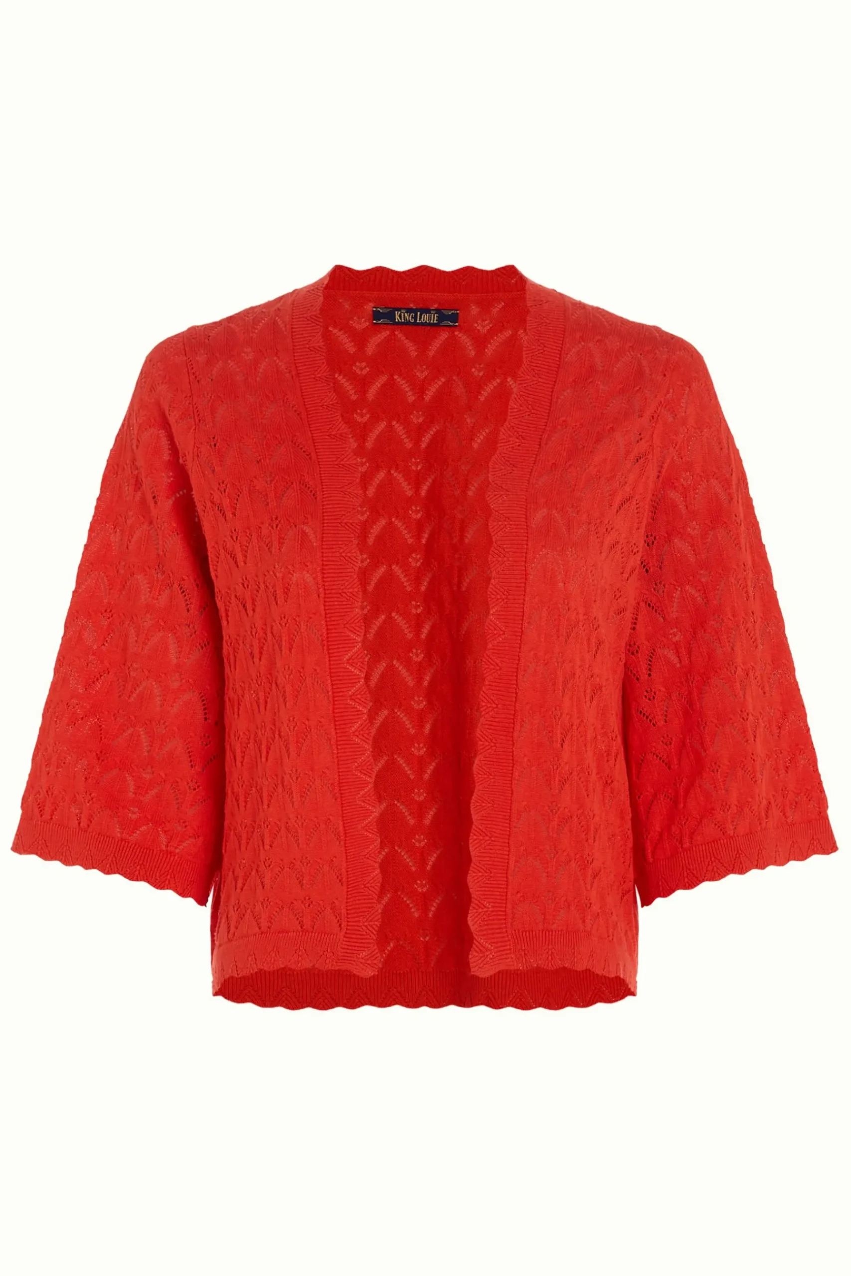 Product details Gebreid vestKimono stijlAfgewerkt met schulprandjesHalve mouwenStretchAjour breisel productspecificatie…