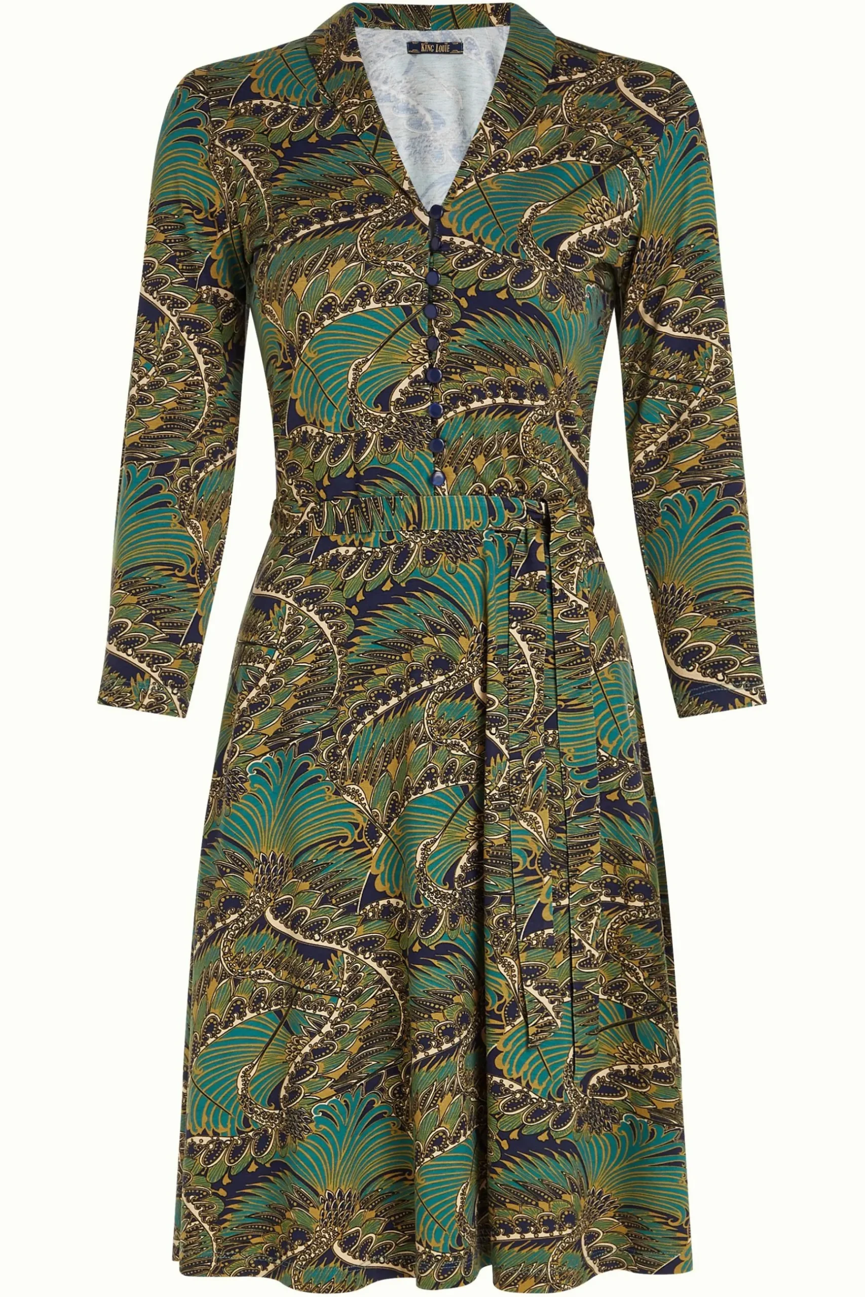 Product details Wijd uitlopende jurkSjaalkraagDriekwart mouwenKnoopsluitingStrikceintuurJerseyStretch stofGrafische pri…