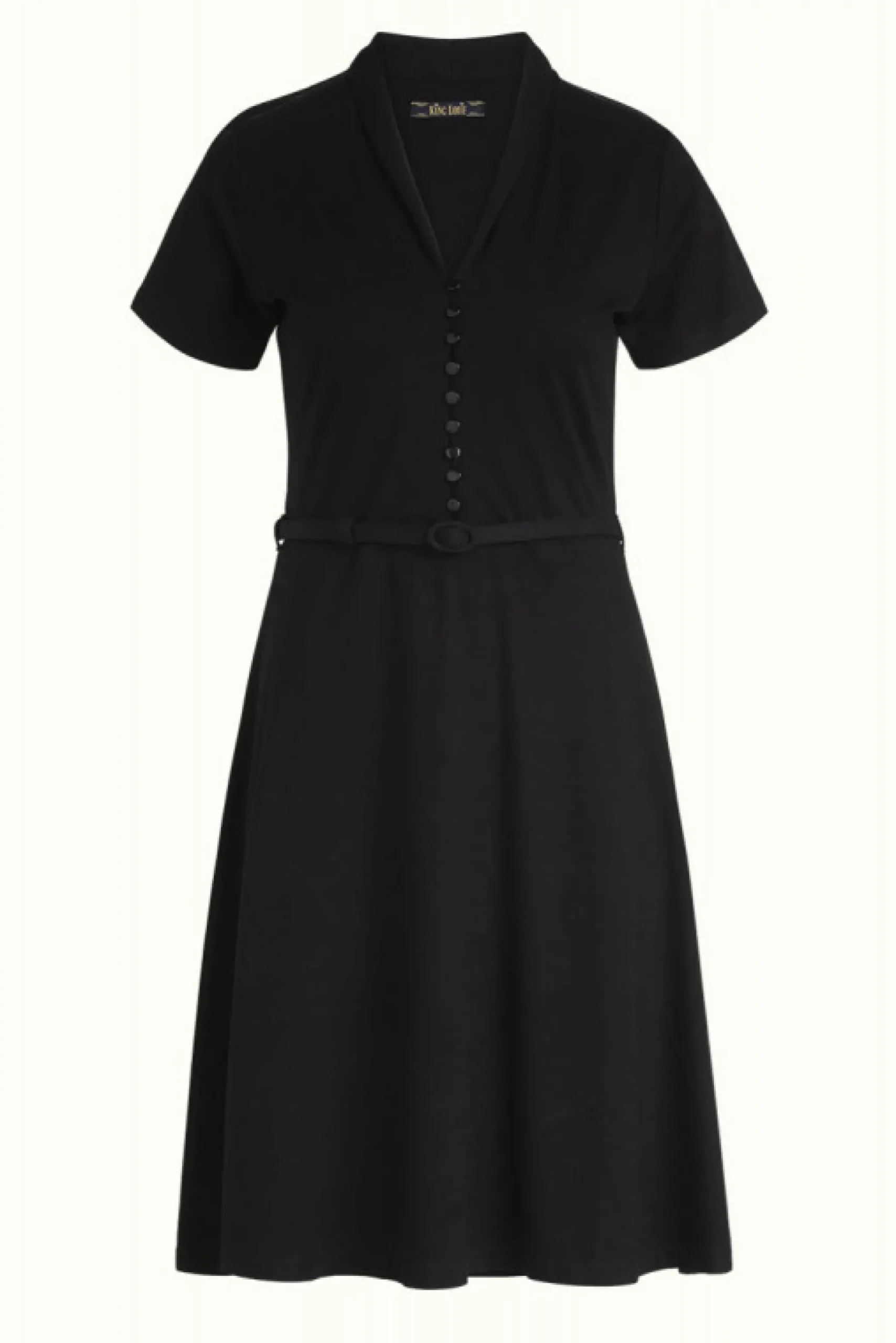 Product details Wijd uitlopende jurkSjaalkraagDriekwart mouwenKnoopsluitingStrikceintuurJerseyStretch stof productspeci…