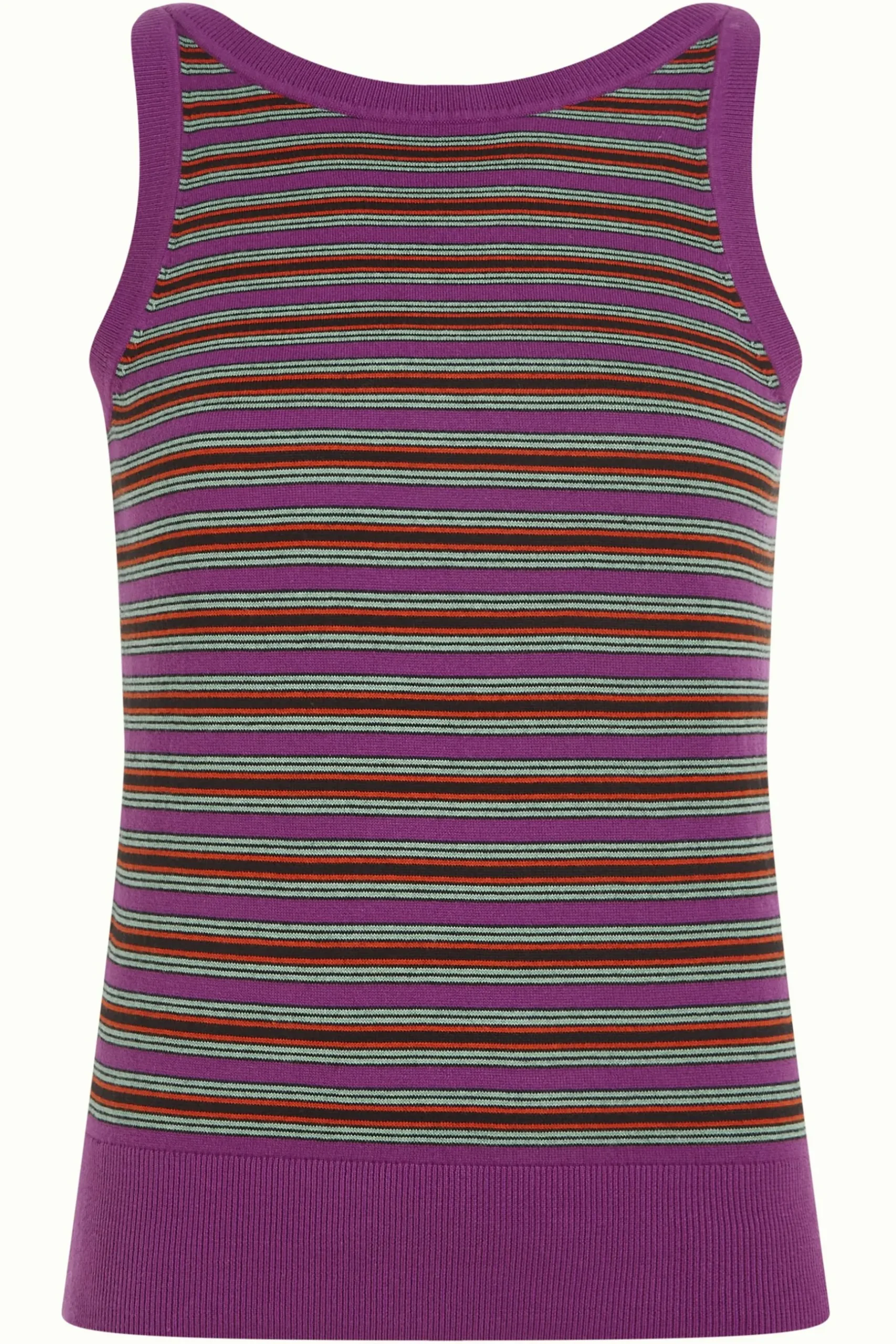 Product details Gebreide topLaag uitgesneden rugPlatte schouderbandenPlooitjes rond de halslijnStretchGestreept patroon…