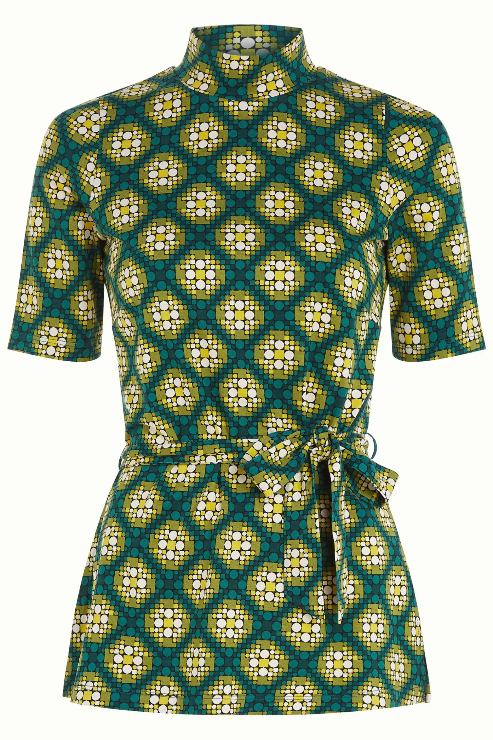 Product details Tuniek topOpstaande kraagKorte mouwenStrikceintuurJerseyStretchGrafische print productspecificatiesGema…