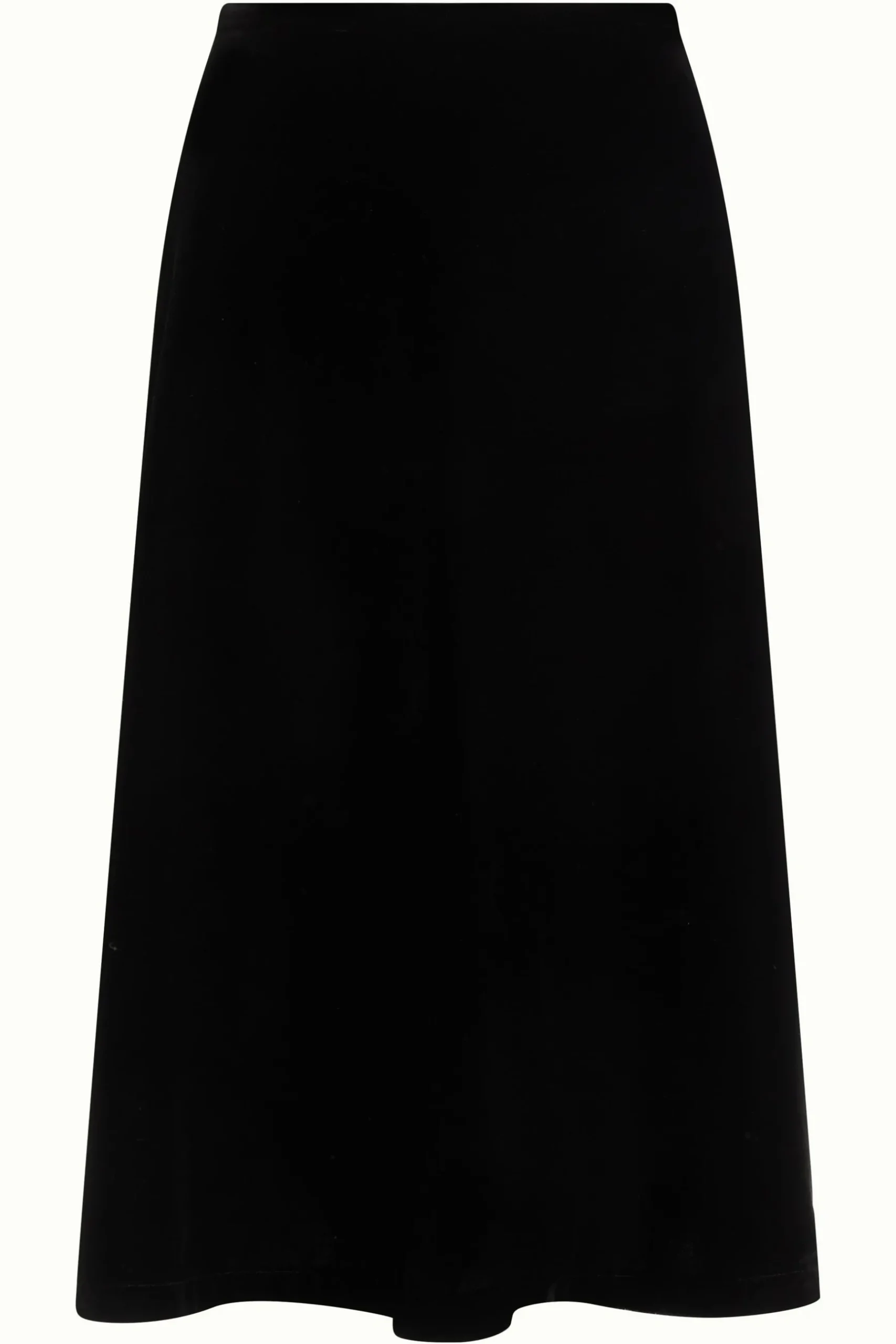 Product details Wijd uitlopende midi rokDunne taillebandRitssluitingGewevenNon stretchVelvet productspecificatiesGemaak…