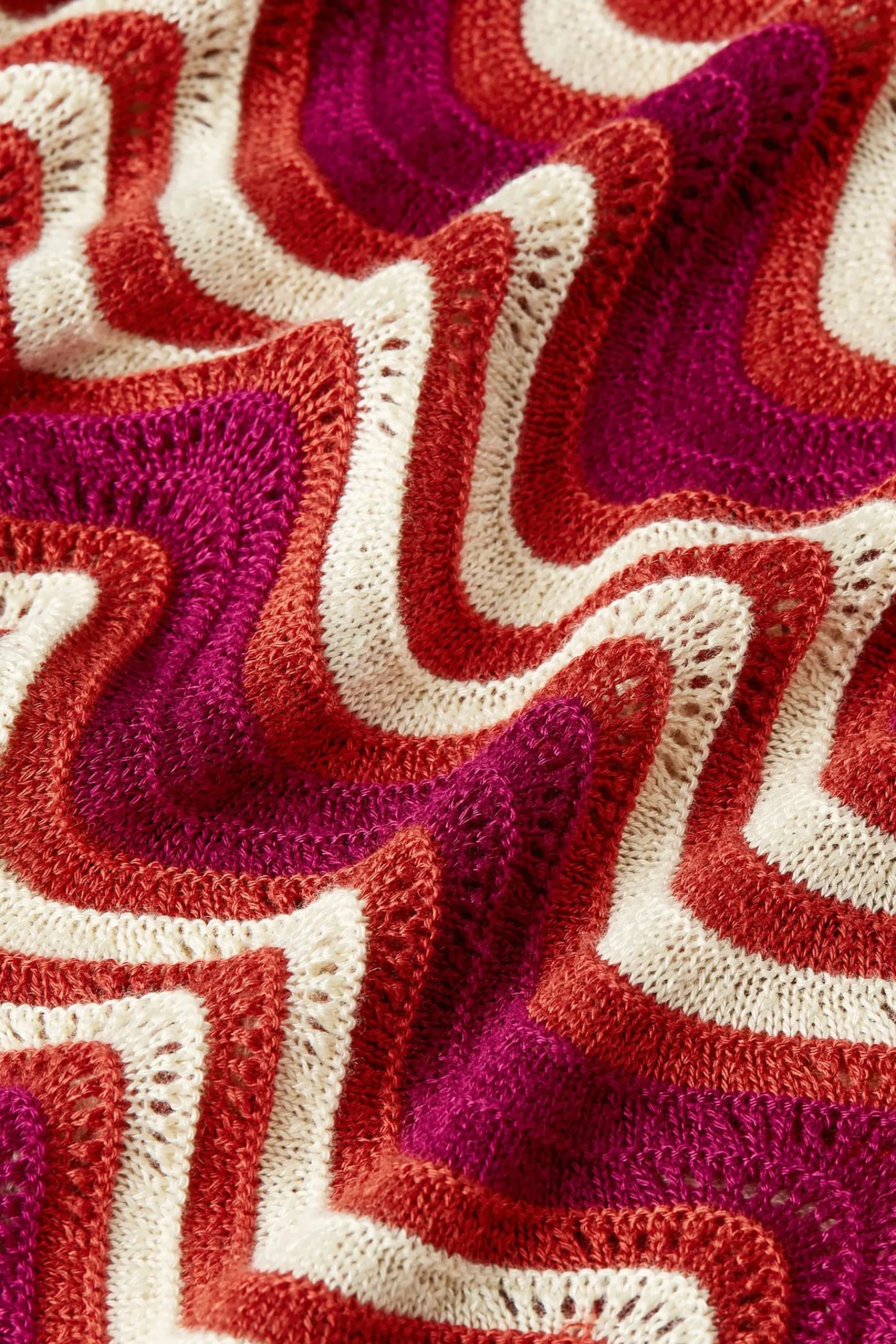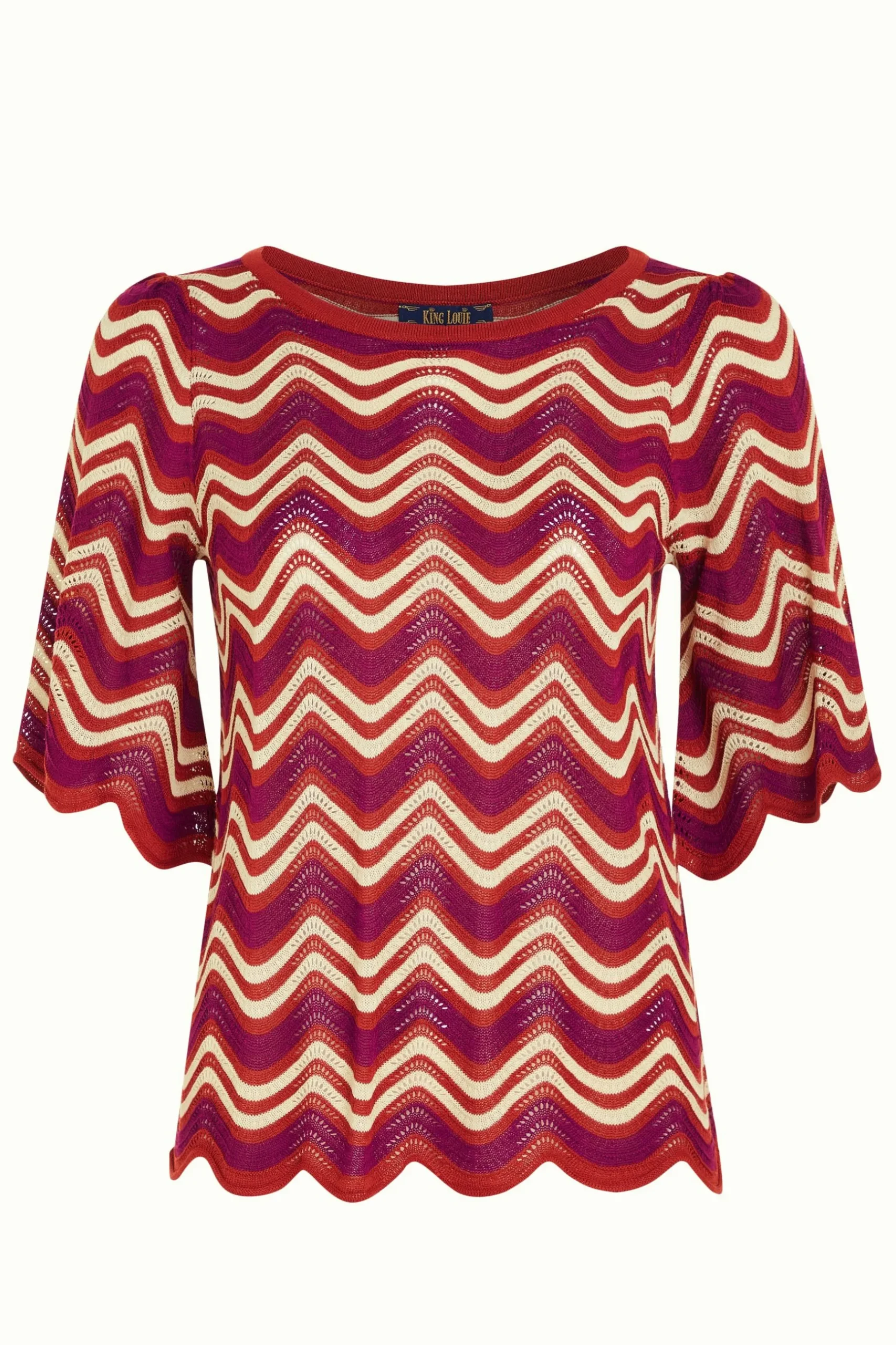 Product details Gebreide topHalve, wijde mouwen met schulprandGeschulpte zoomAjour breiselStretchGolvend patroon produc…