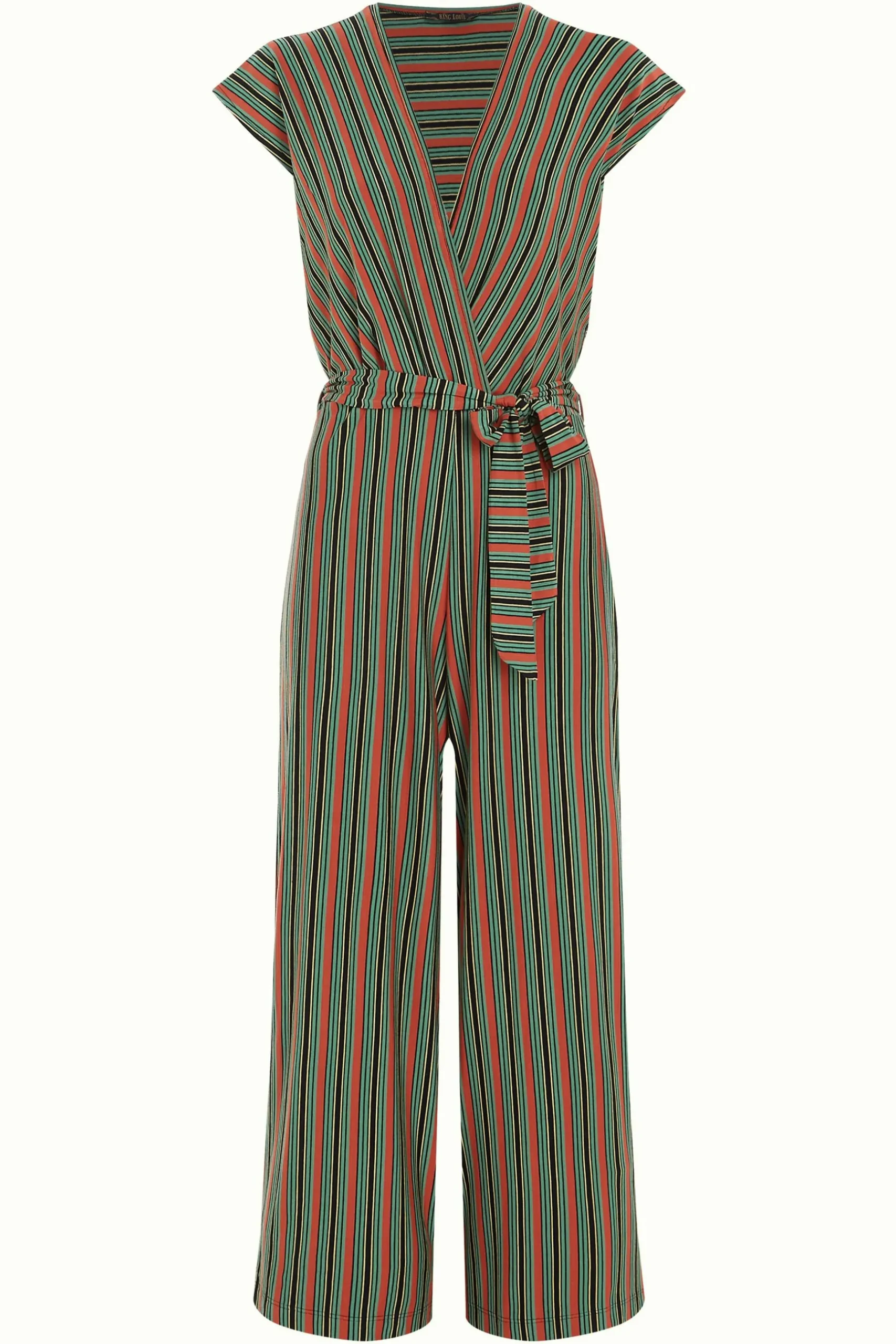 Product details Jumpsuit met overslagKapmouwenVast strikceintuurRechte pijpenJerseyStretchGestreepte print productspeci…