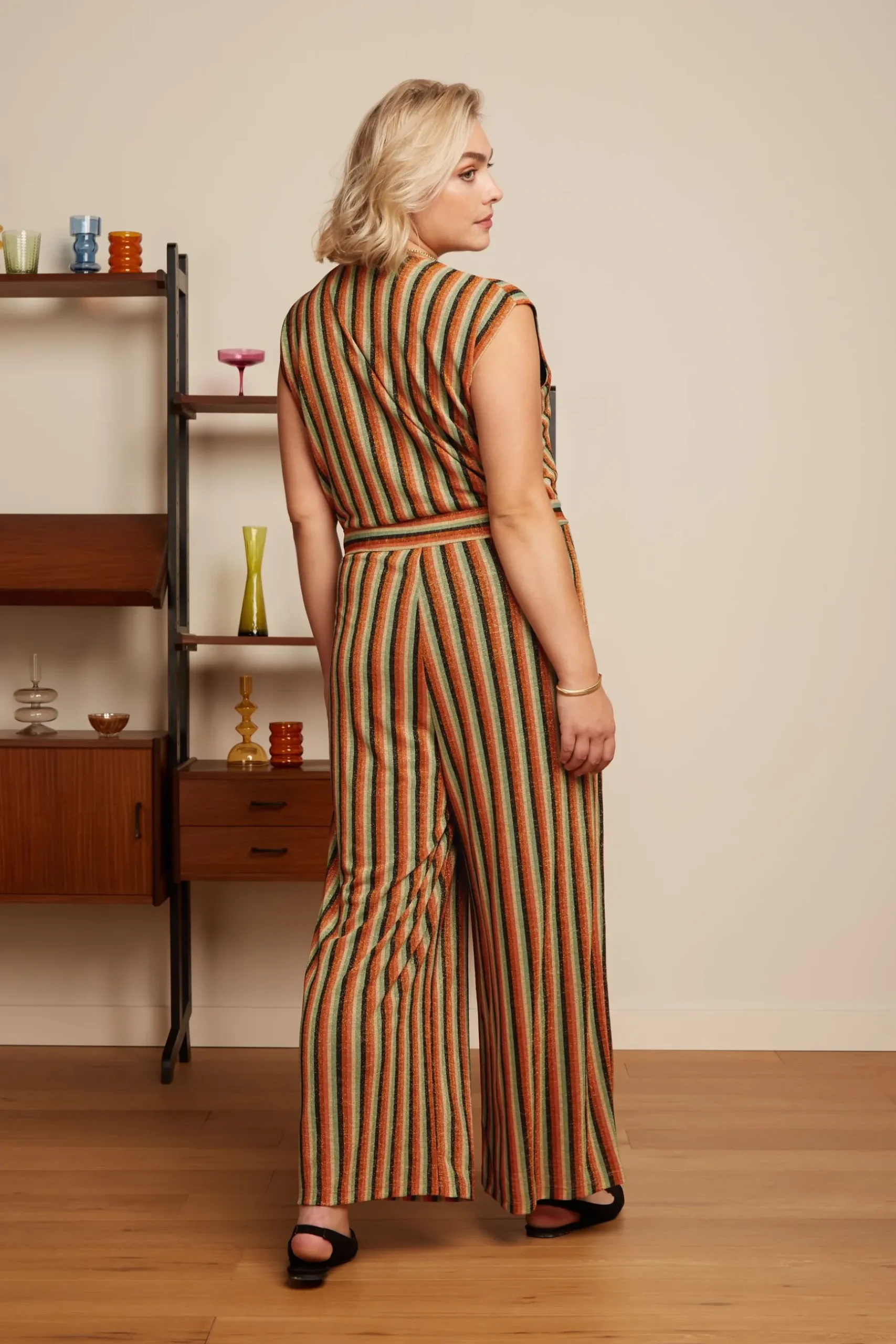 Product details Jumpsuit met overslagKapmouwenVast strikceintuurRechte pijpenJerseyStretchGestreepte print productspeci…