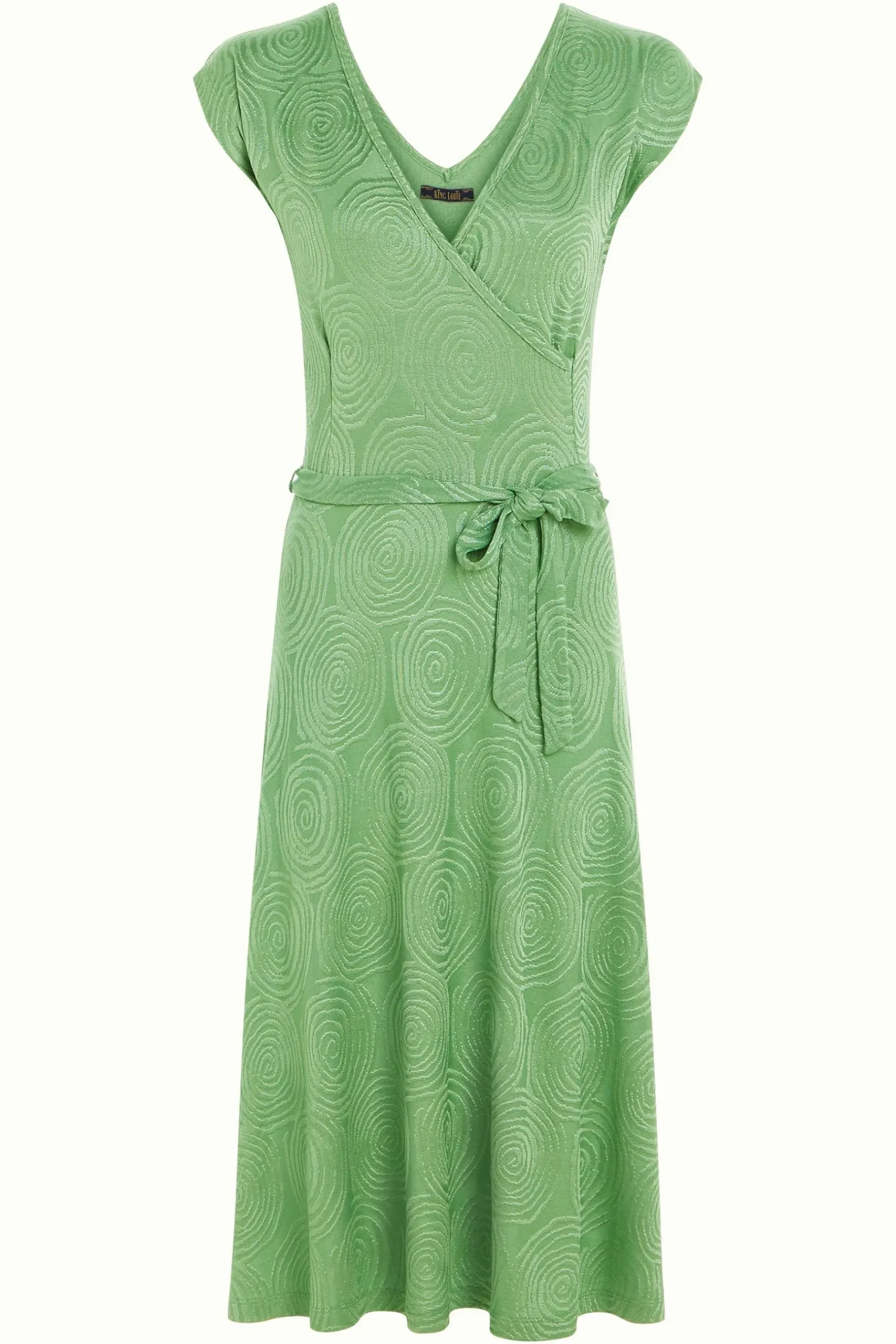 Product details OverslagjurkAangeknipte korte mouwV-uitsnede op de rugUitlopende rokStrikceintuurJersey jacquardStretch…