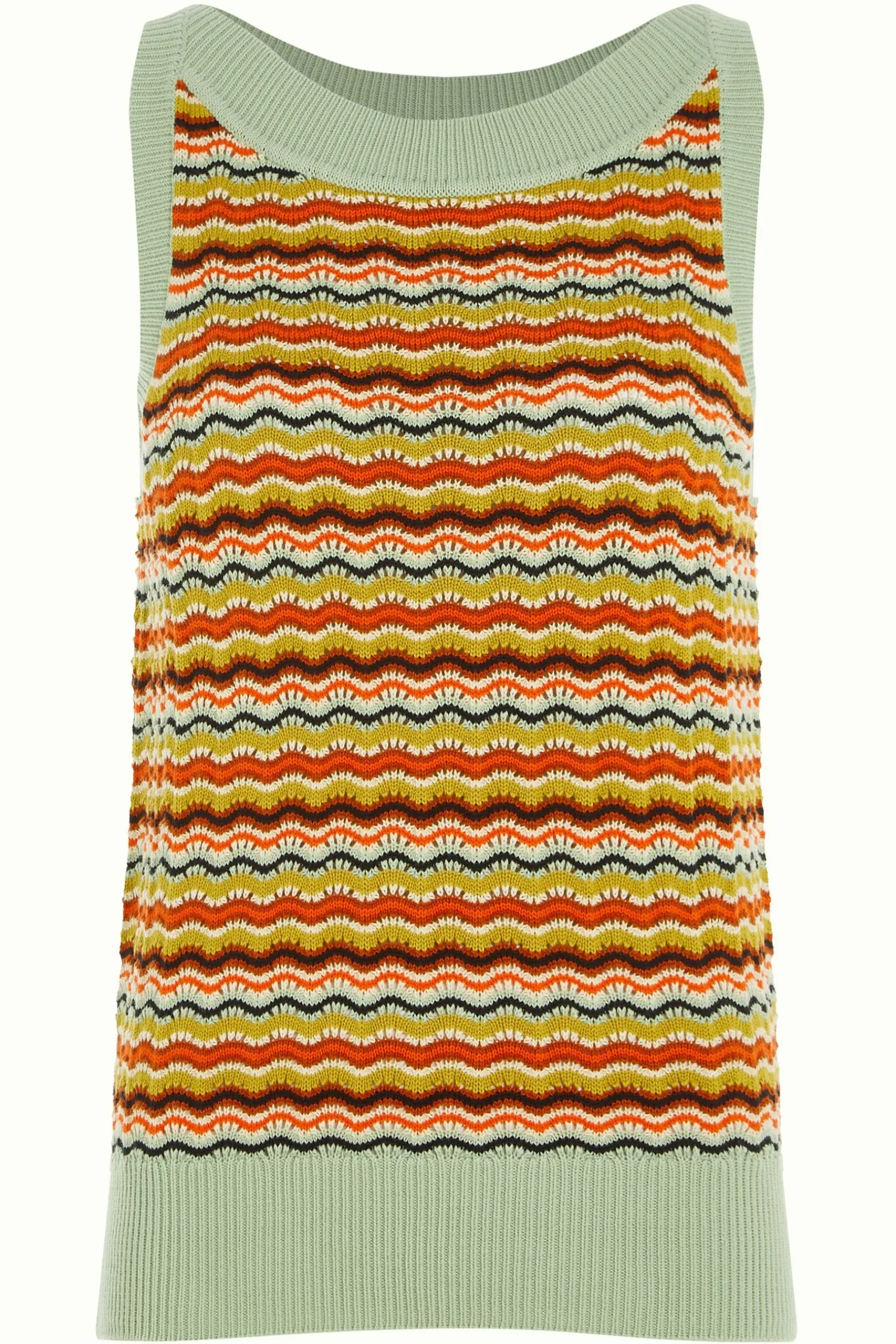 Product details Mouwloze topRonde halsGeribbelde boordenAjour breiselStretch Golvend patroon productspecificatiesGemaak…