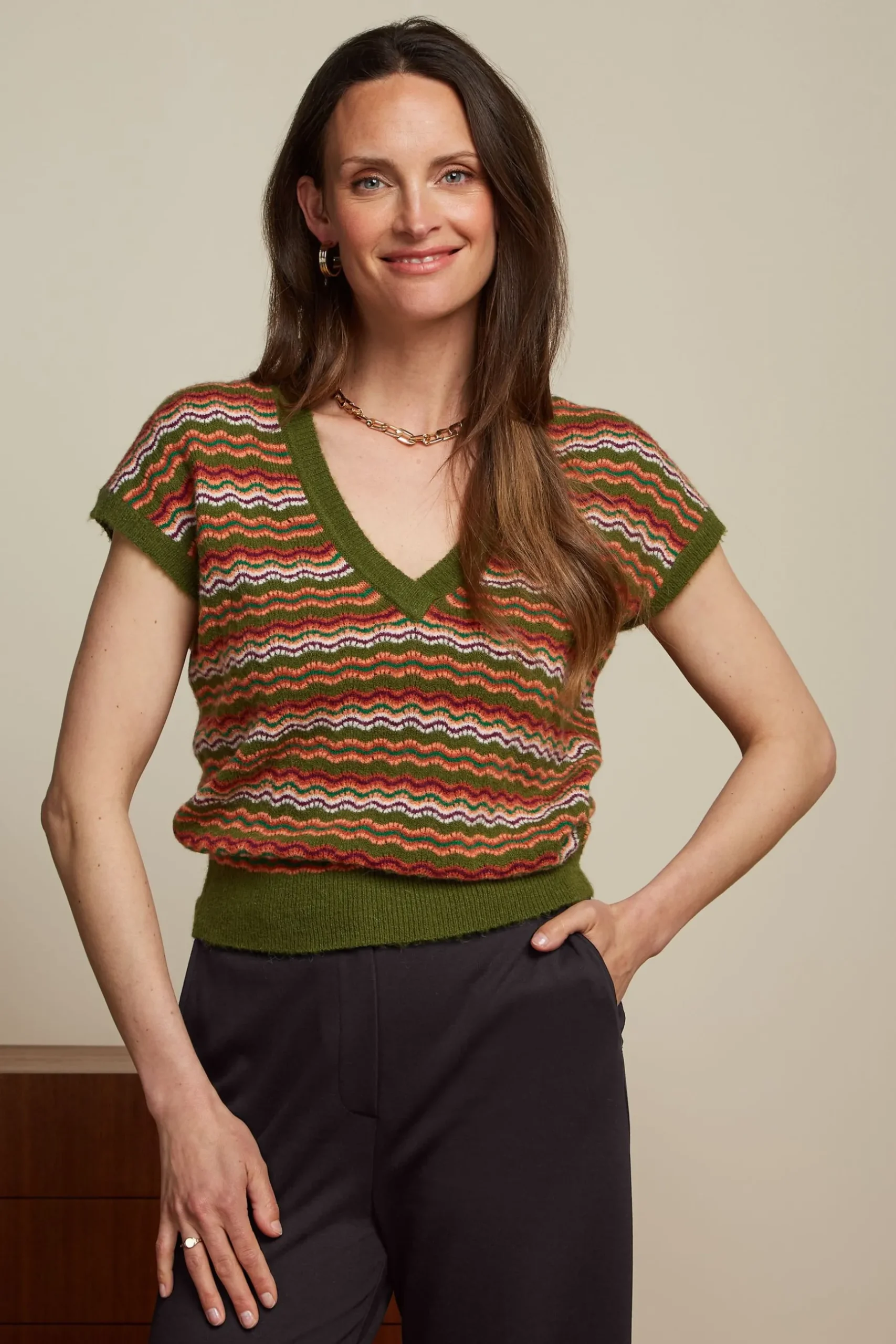 Product details SpencerV-halsMouwloosGeribbelde, contrasterende boordenGebreidStretch stofGolvend motief productspecifi…
